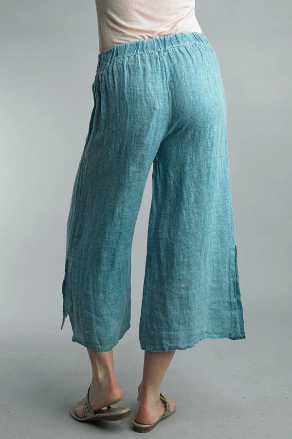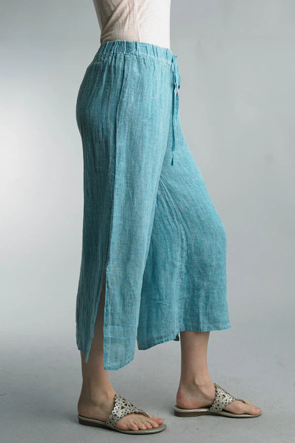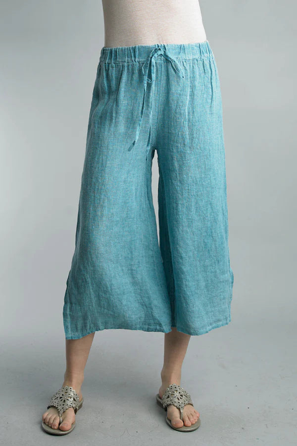 These wide leg pants are trending to be worn at or above the ankles. The tie front and elastic waste band makes them easy to wear a shirt tucked in or out.