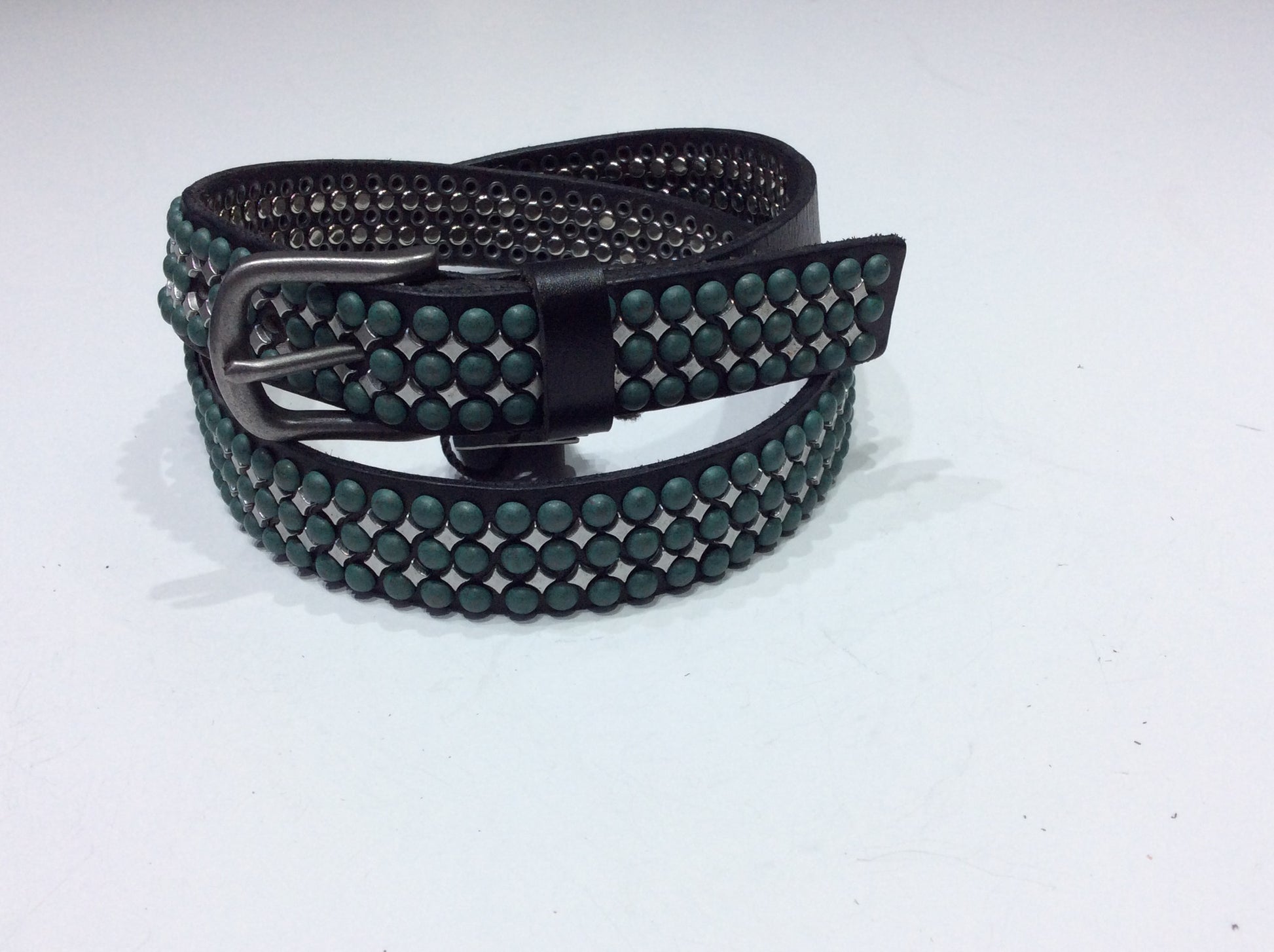 Belts-Medium Width Leather with Natural Green Stone and Silver Stud Embellishment