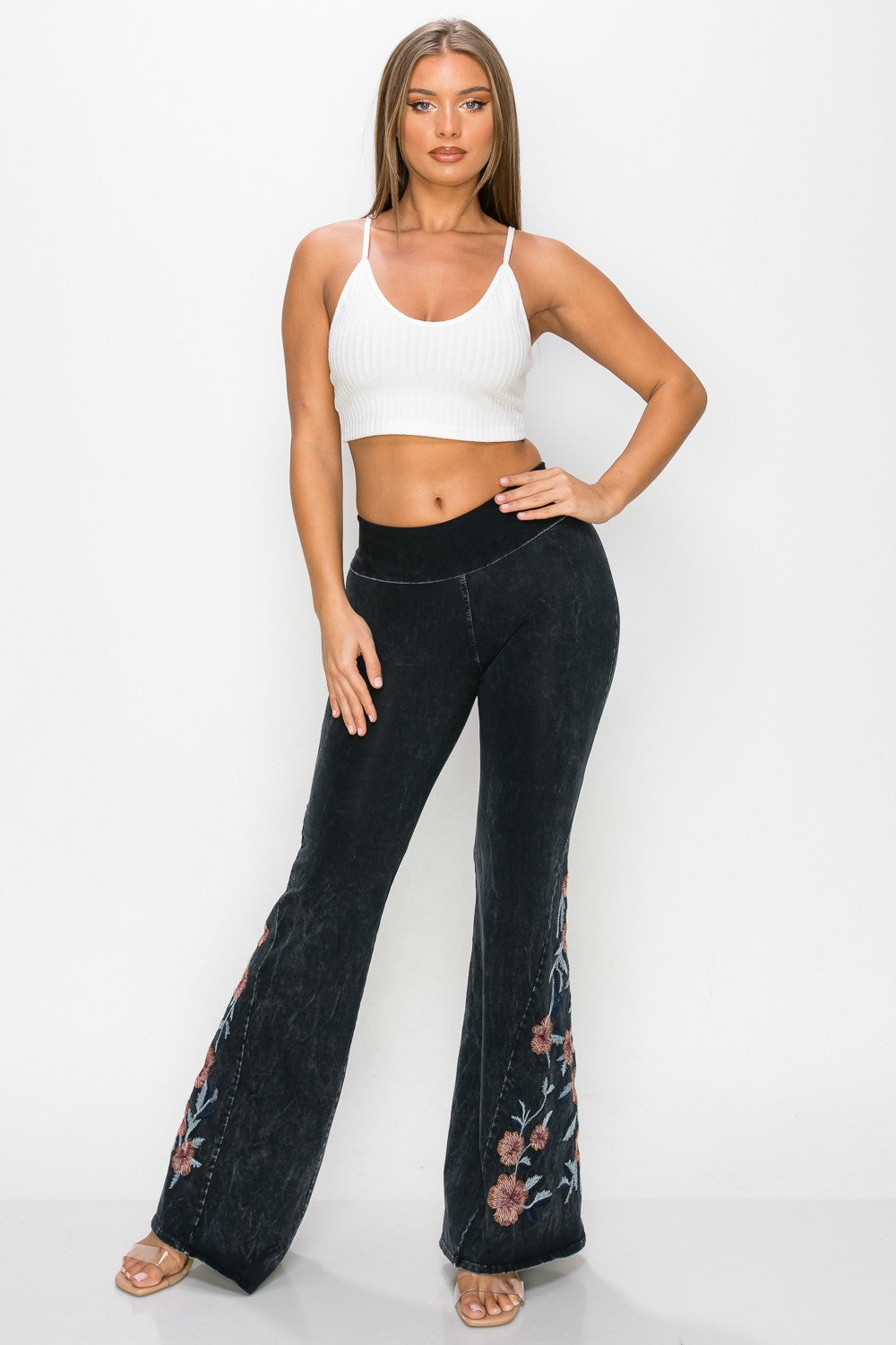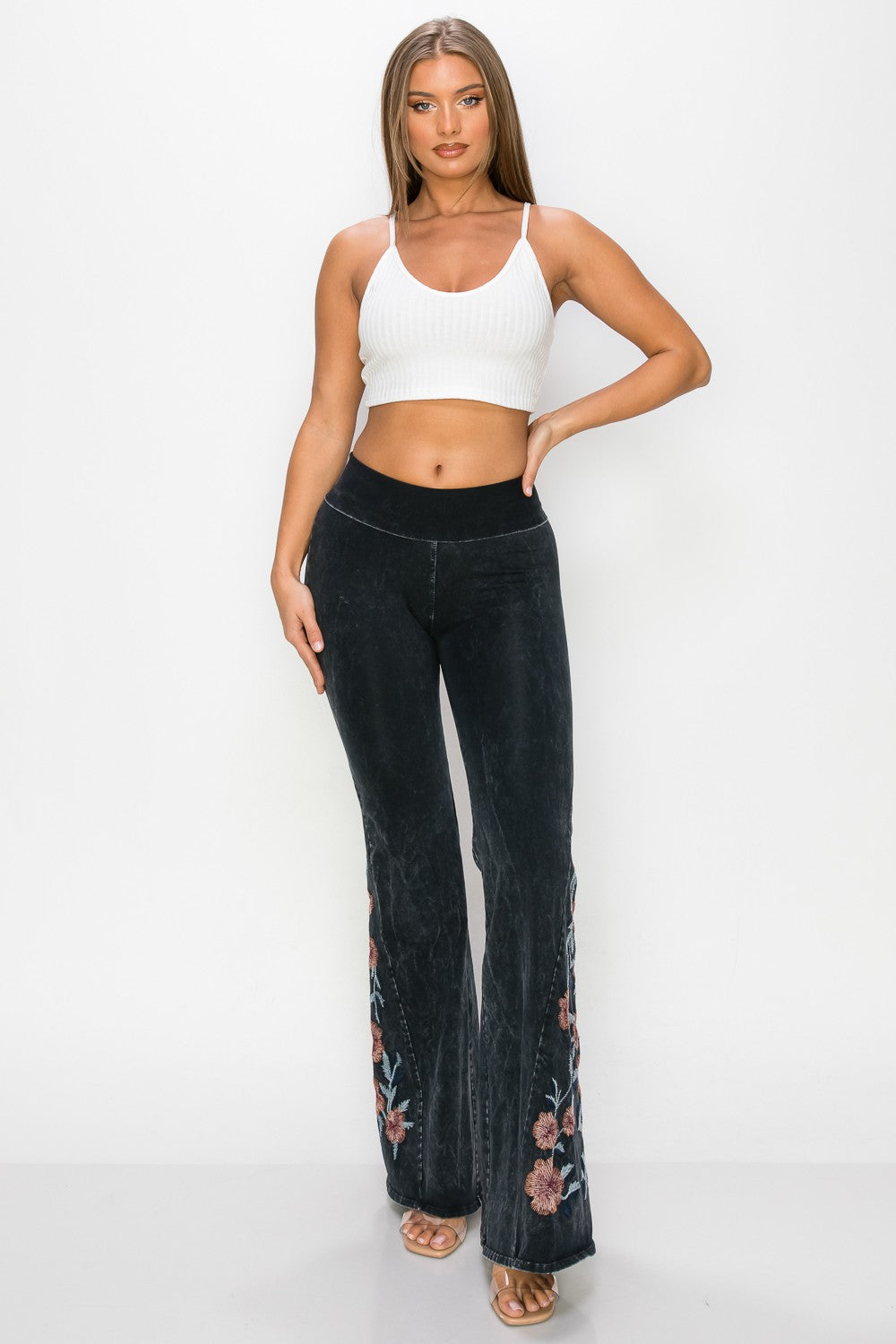 These mineral washed pants have a fun floral embroidered bell bottom. They are made from a soft and stretchy material that is amazingly comfortable but NEVER bag at the knee.. The embroidery is mauve, burgundy, and denim blue colors. You will be surprised of the amazing comfort of these pants. Enjoy their comfy feel and fantastic look.