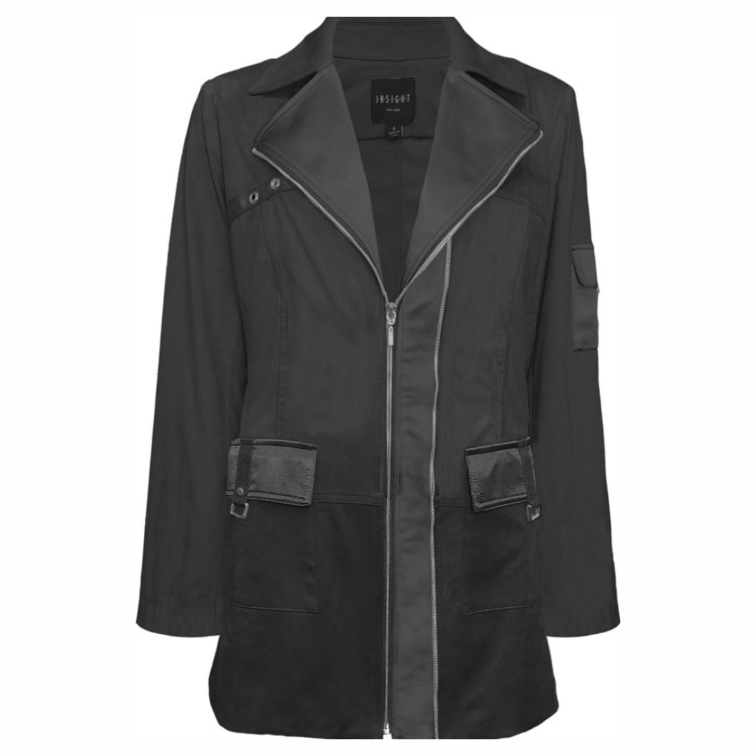 Sleek, functional, and ready for anything. This faux vegan leather jacket features a silver zip closure, grommet details, and multiple functional pockets that make it as practical as it is stylish. The off-centered satin-finish stripe down the front and lapels makes this jacket more interesting and unique. With long sleeves and a polished silhouette, it’s the perfect outer layer for fall days and nights out.