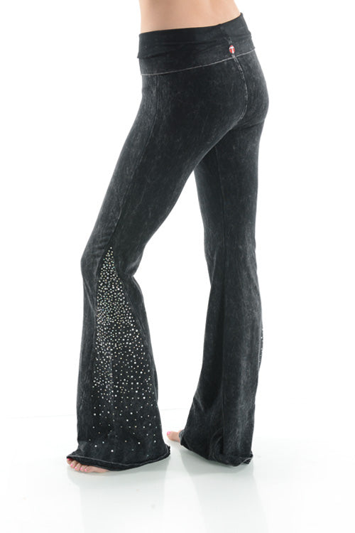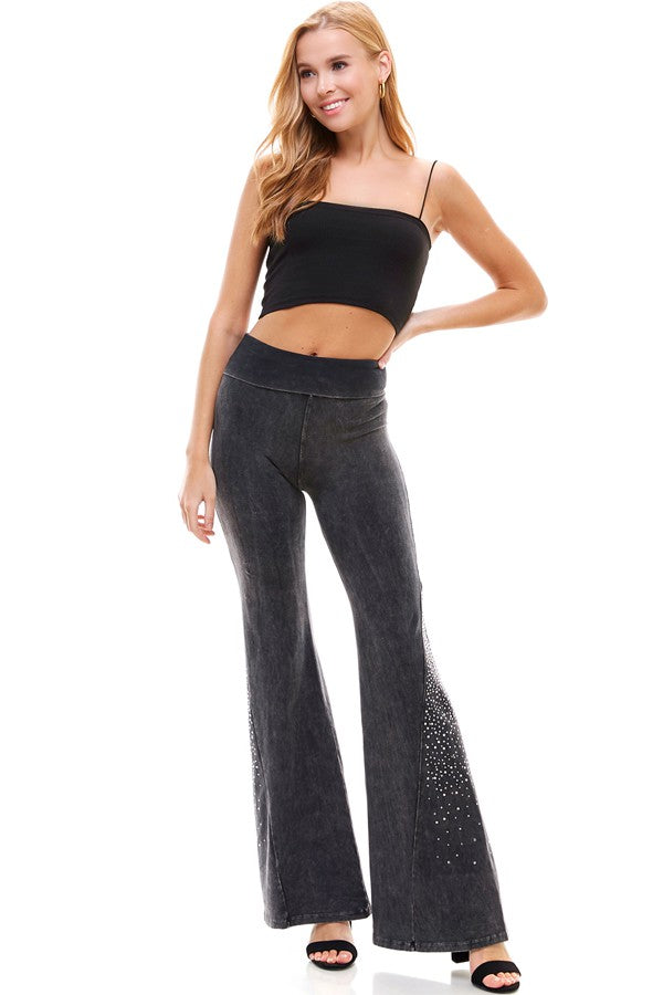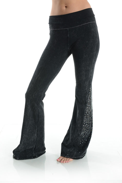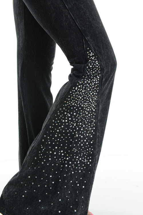 These fun, blinged yoga style pants are showstoppers! Widely flared bell bottoms are LOADED with sparkly rhinestone gems. The mineral wash fabric is so soft and comfortable, you won't ever want to take theses off!