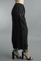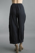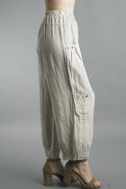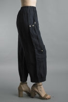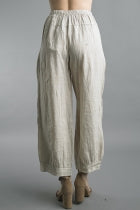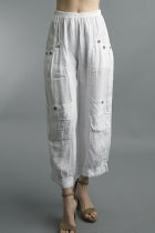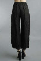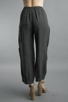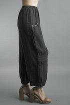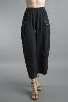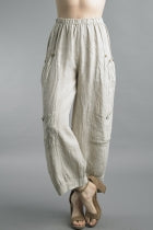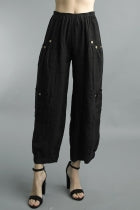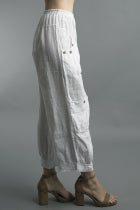 Ankle length linen pants with four deep pockets accented by coconut shell buttons. The soft elastic waist is comfortable and lays flat. Amazing Italian linen is so comfortable in this cute longer crop designed pants. The button accents add to this fun look. Choose from five great colors!