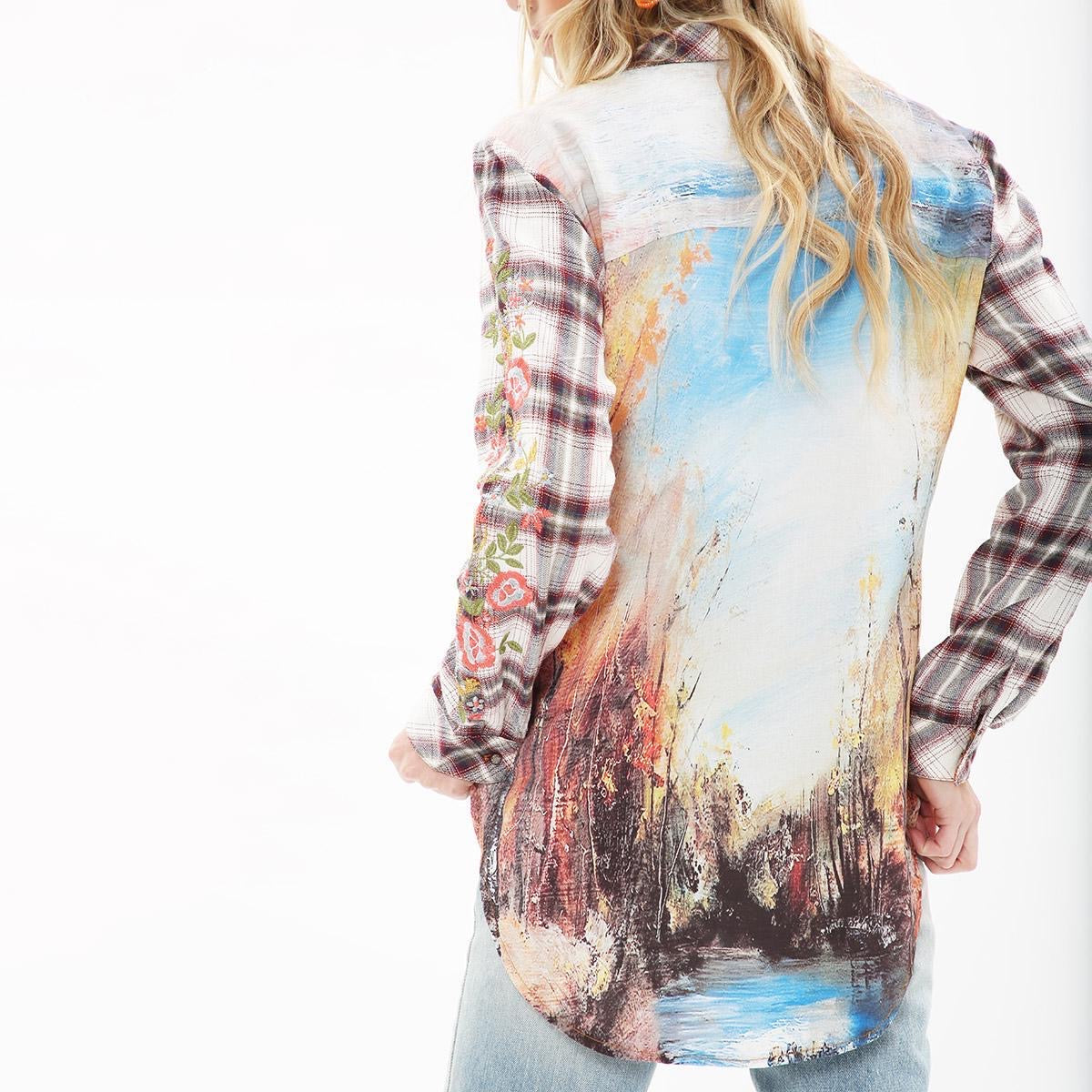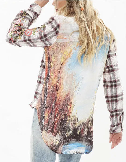 This comfortable plaid shirt has so many embellishments! With embroidered sleeves, a light ruffle trim and brooch, plus a beautiful nature scene as the back panel makes this a great shirt to enjoy.