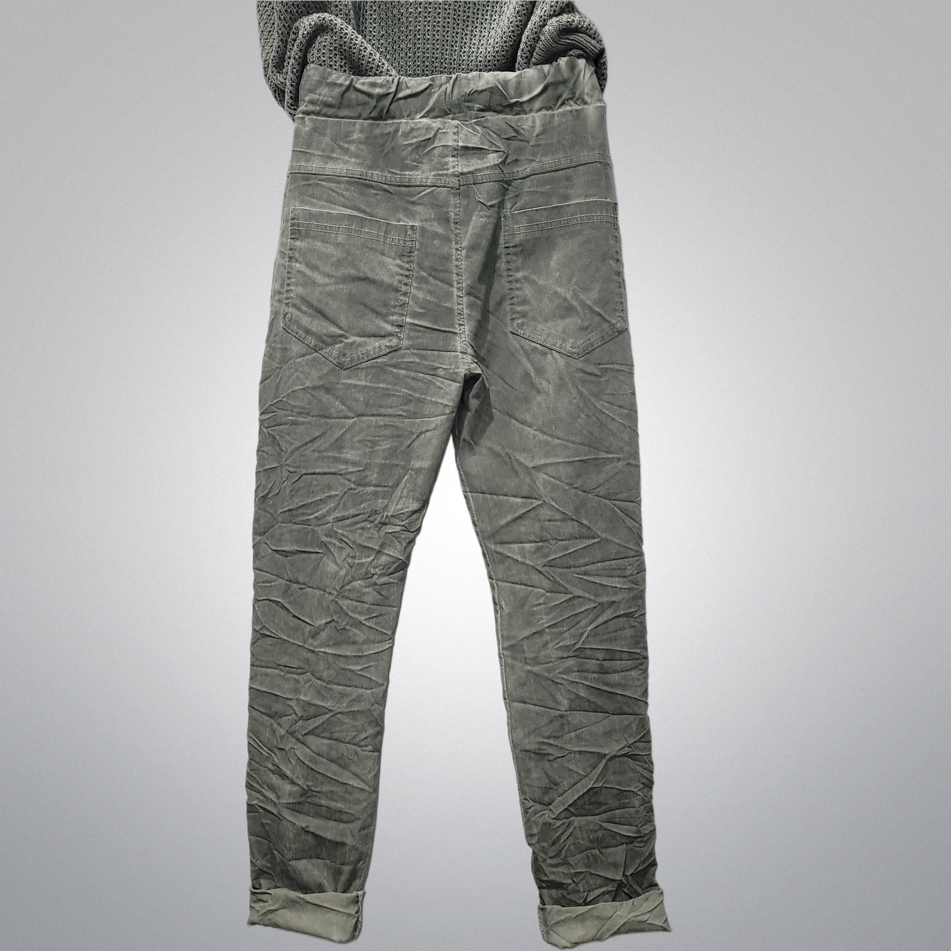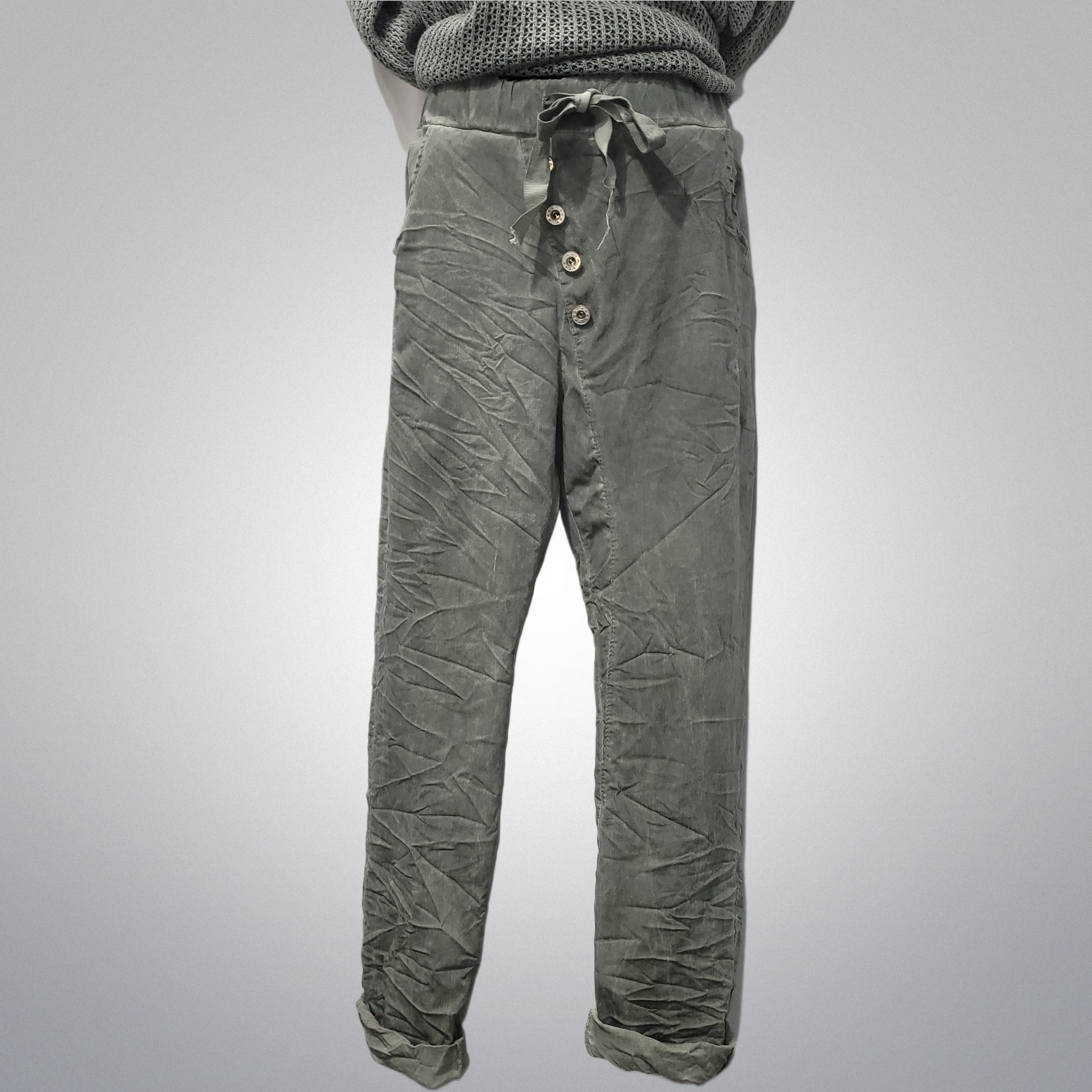 Do you love super comfortable, stretchy pants? Then you would love all of our "sisterhood" pants, but especially this pair with the unique slanted front button up feature. They are a beautiful washed olive shade that can be very neutral.