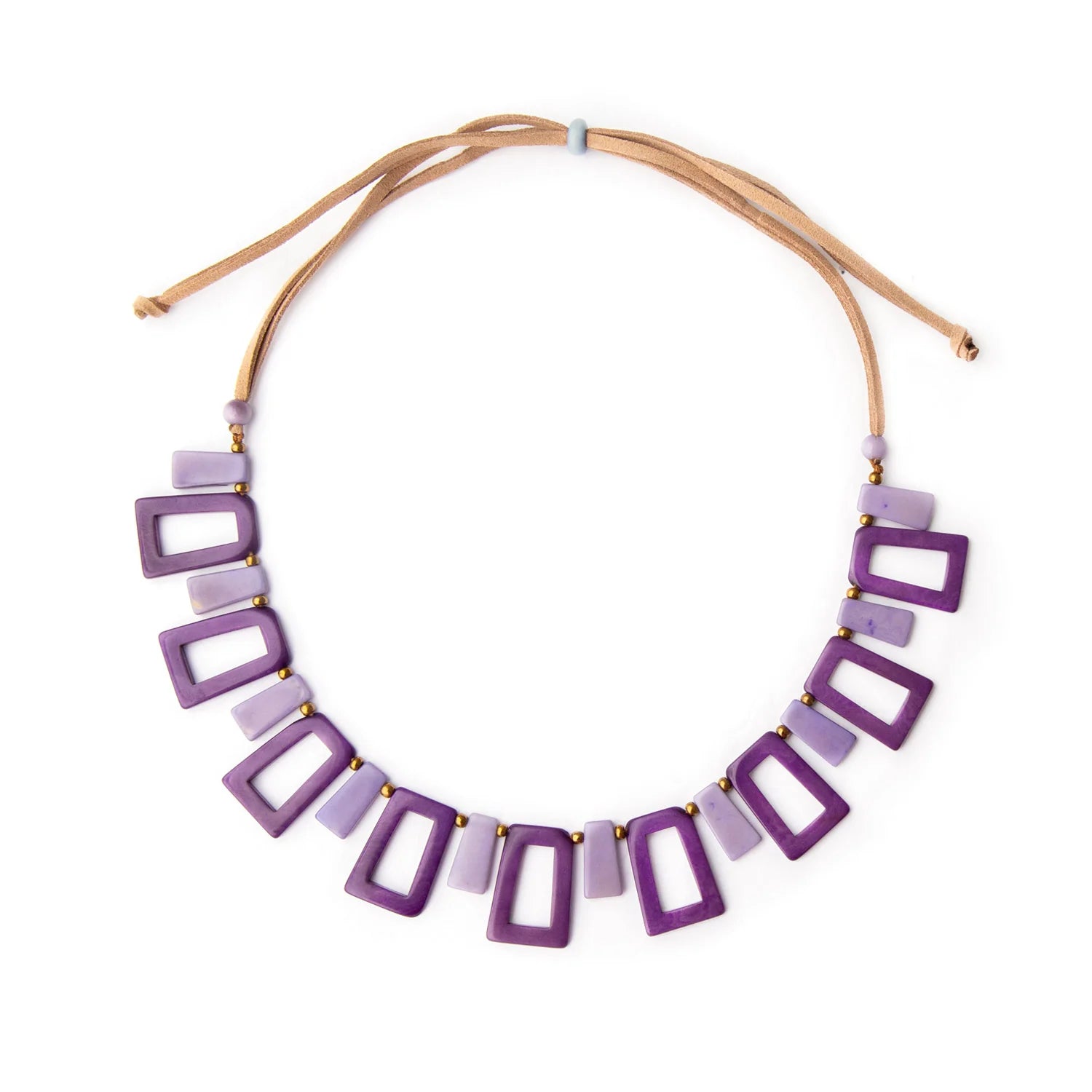 A geometric, vibrant necklace made with hand-carved tagua pieces! Want matching earrings? Find them by searching geometric earrings or with their style code #1E1732.