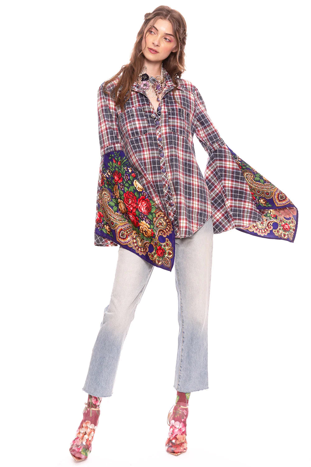 Floral Plaid Contrasting Bell Sleeve Shirt