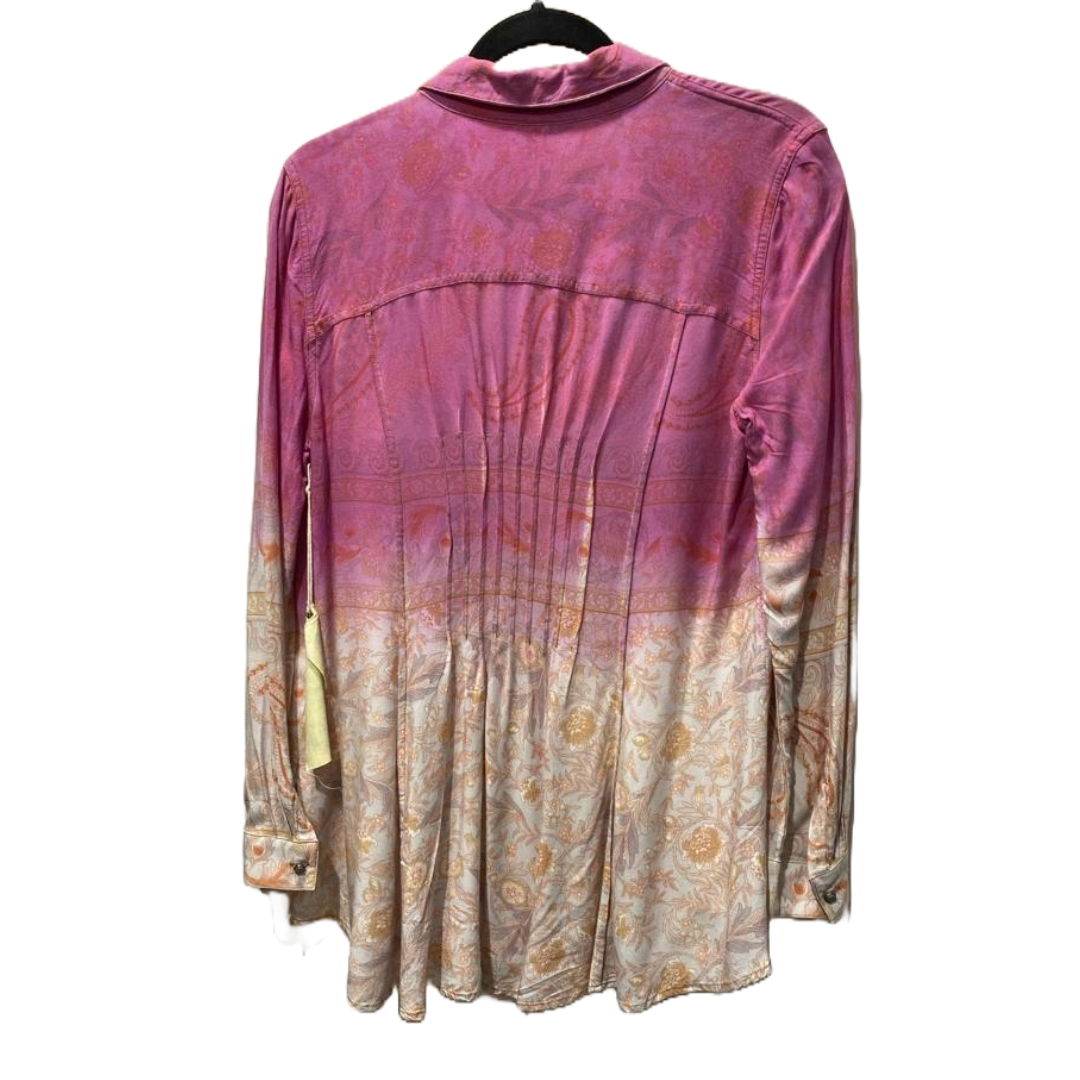 Two shades that merge with a print of flowers, leaves and more details. The fabric is soft and lightweight, and the shirt has two front pockets.