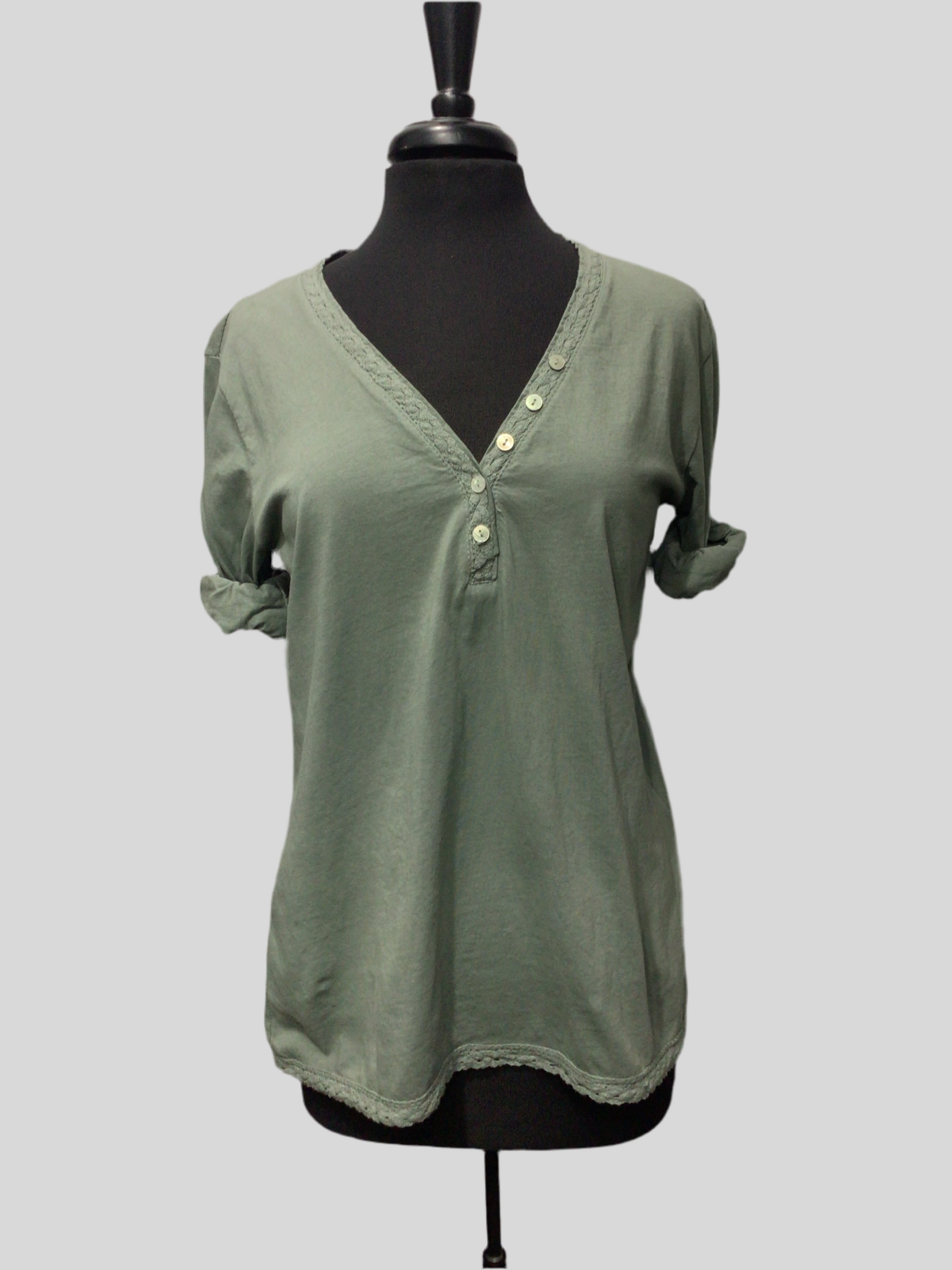 Nothing is better than a soft, Italian cotton top, especially when it is lace-trimmed, V-neck with shell buttons, and long sleeves. Wear them rolled up for a European look, or any length you prefer from long to your waist or folded up to any length you like. Comfortable, stylish, and comes in four great colors. You will love wearing these cute Italian cotton tees.