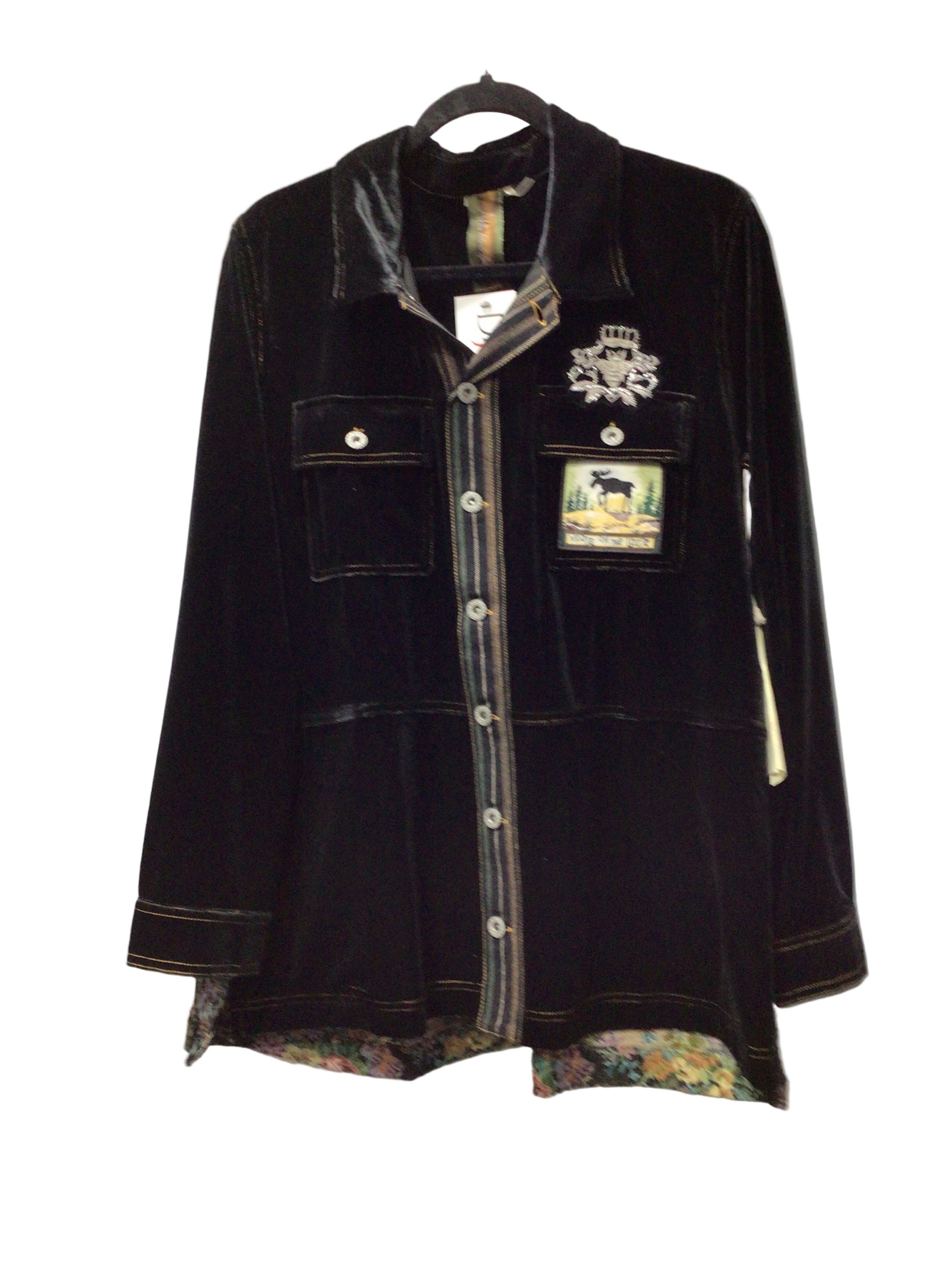 This fun "Moose on the Loose" velvet with floral back Shacket is so soft and comfortable. This easy-to-layer garment can be worn in many ways. Enjoy it as an over-sized shirt or an utility jacket. The pocket details are amazing....from Queen Bee to Moose on the Loose, you will always be the center of attention in this great product!