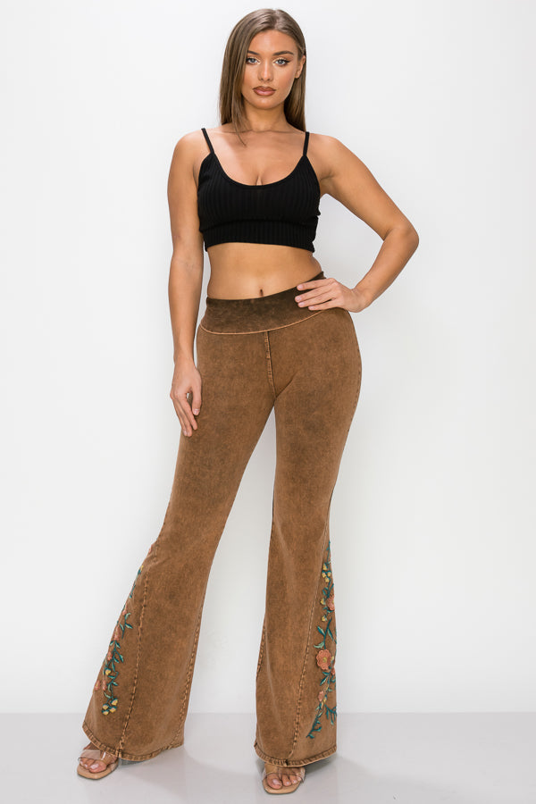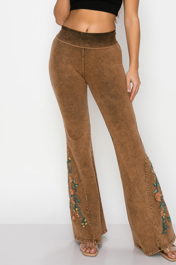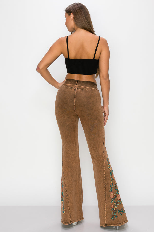 These mineral washed pants have a fun floral embroidered bell bottom. They are made from a soft and stretchy material that is amazingly comfortable but NEVER bag at the knee.. The embroidery is mauve, burgandy, and denim blue colors. You will be surprised of the amazing comfort of these pants. Enjoy their comfy feel and fantastic look.
