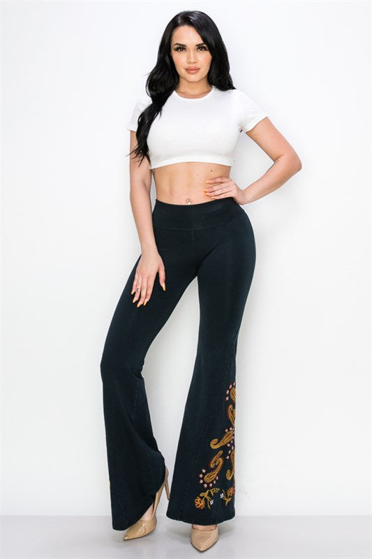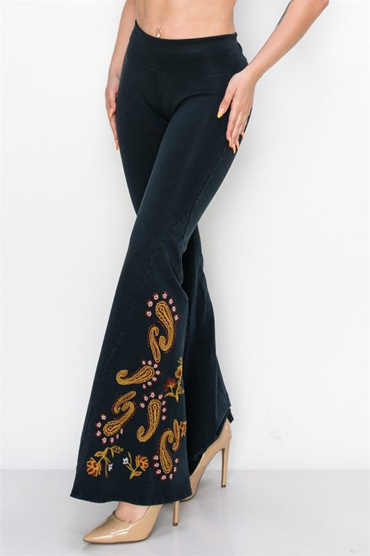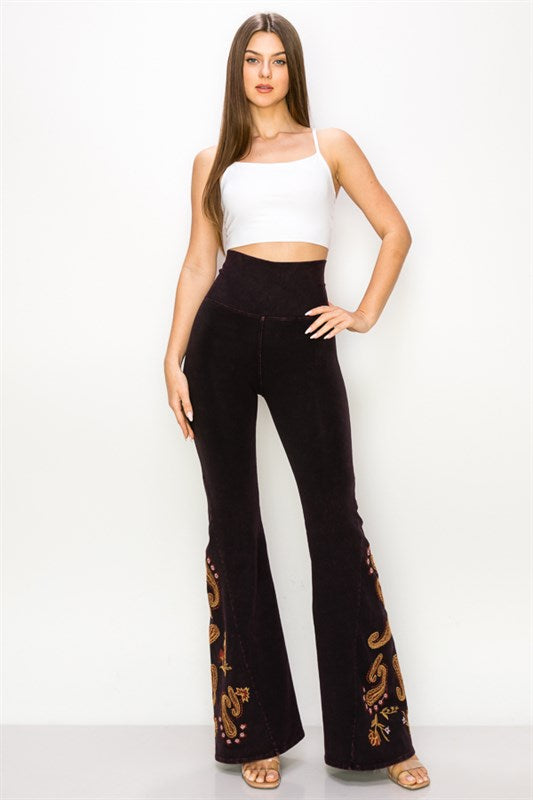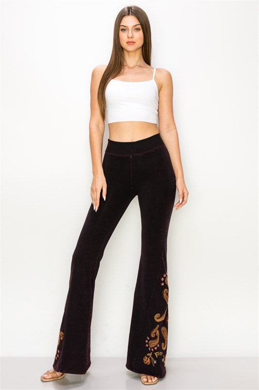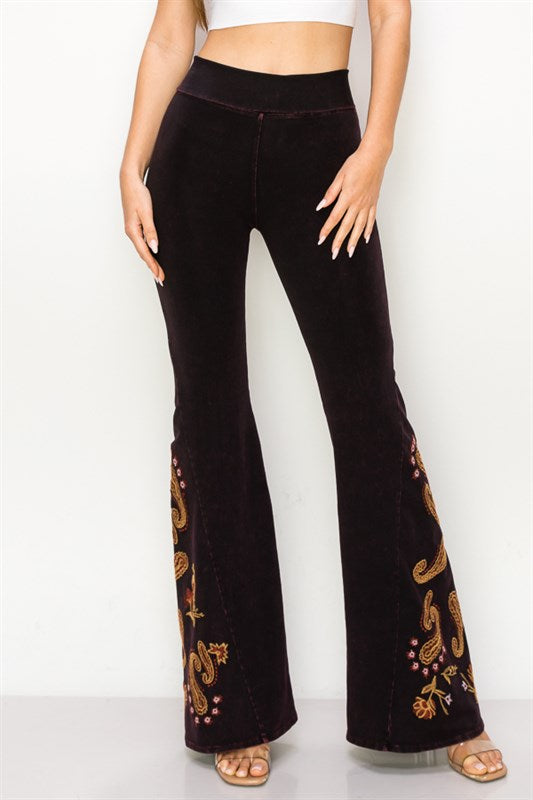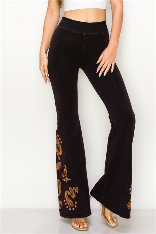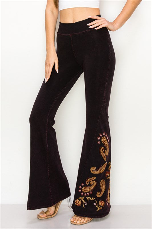 These paisley embroidered bell-bottom yoga style pants come in two great colors. Choose from a deep mineral washed purple or mineral wash black background. They are super soft and comfy, plus they NEVER bag at the knee. You will be surprised of the amazing comfort of these pants. Enjoy their comfy feel and fantastic look.