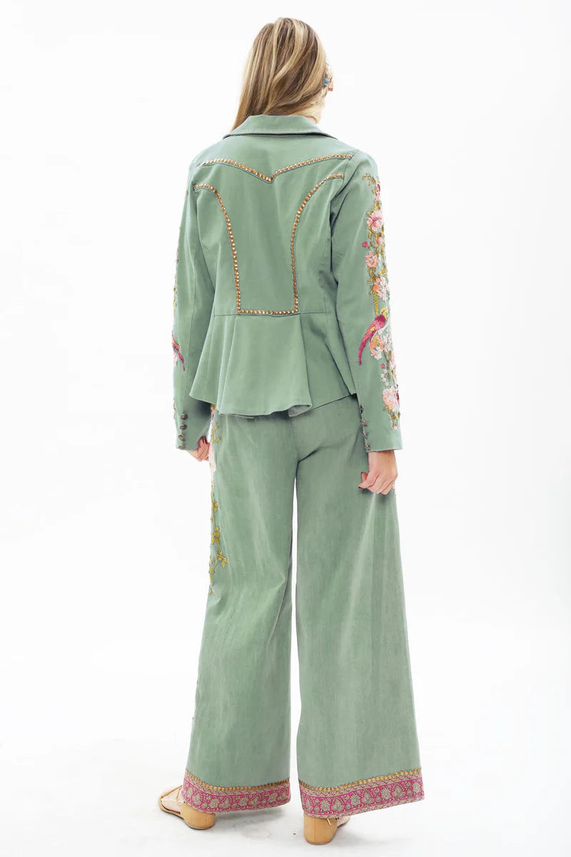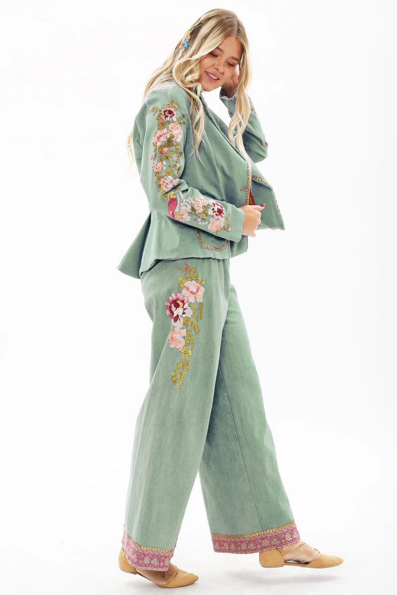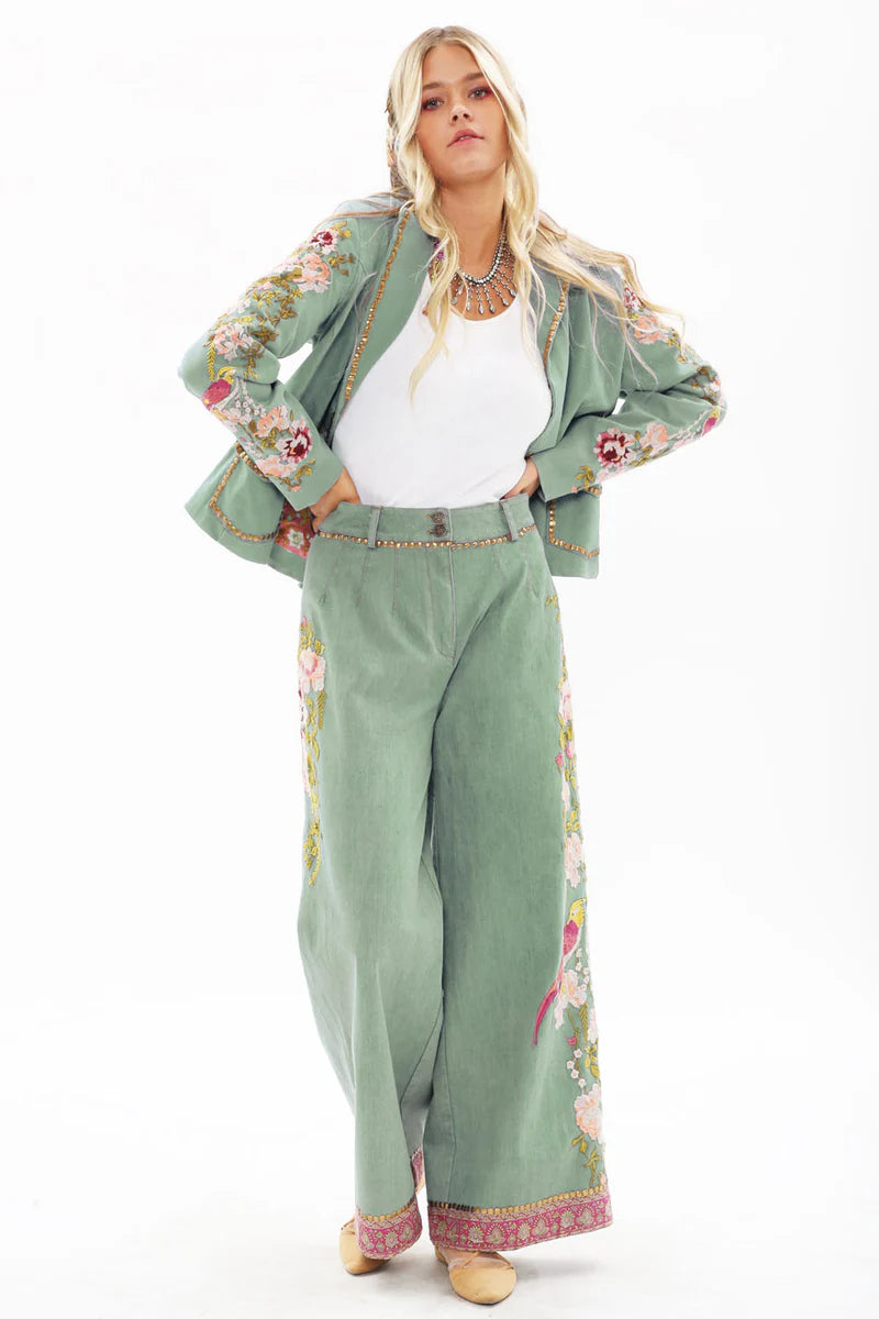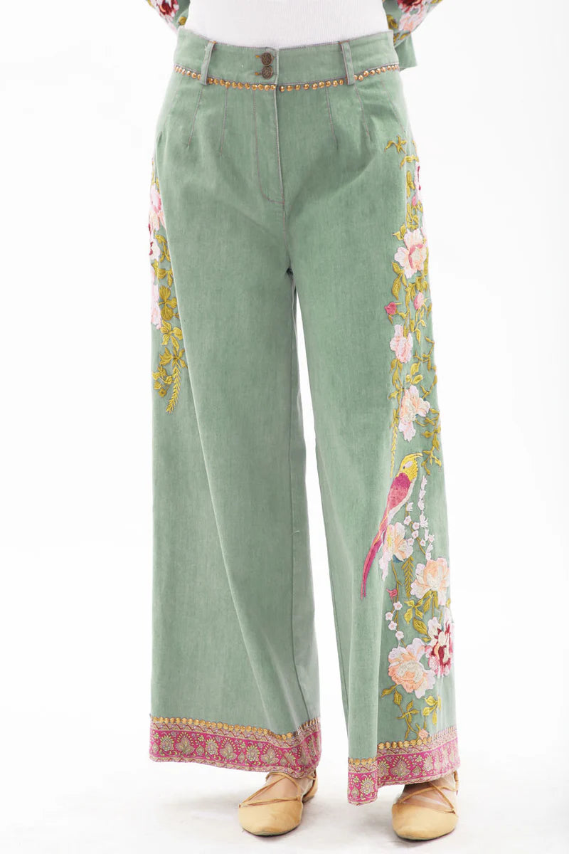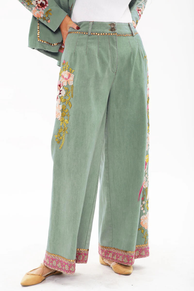 - Embroidered & studded washed denim pants with floral contrast print on hem