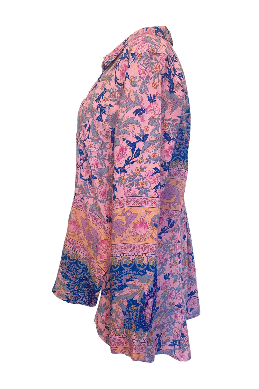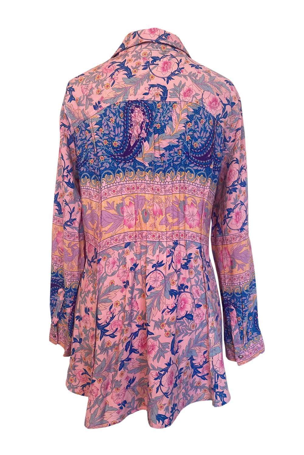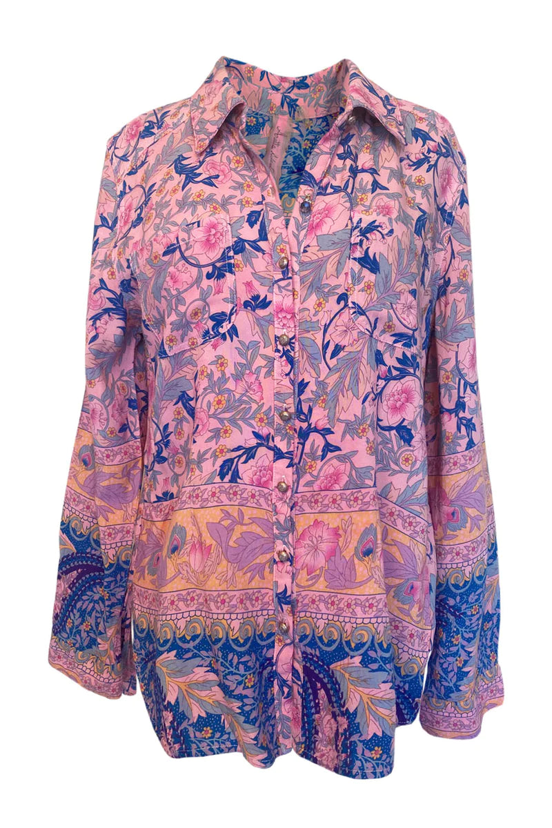 This denim friendly blouse has a washed pink base with a floral paisley border print shirt with pintuck back. Dress it up or throw over jeans for a fantastic look.