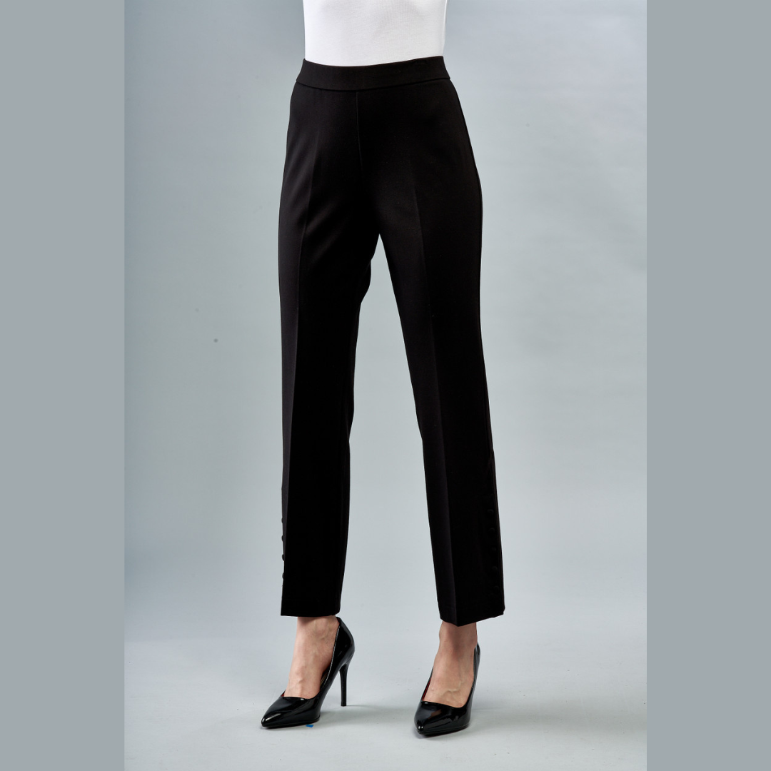 Sleek and versatile, these solid black, scuba knit pants feature a pull-on design with a flattering fit that moves with you. Detailed with five side cover button snaps and functional front pockets for a polished yet practical finish. With a 28 ½" inseam, they pair effortlessly with heels, flats, or boots.