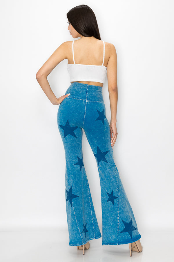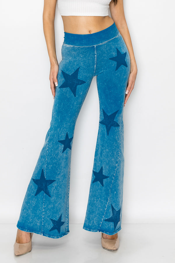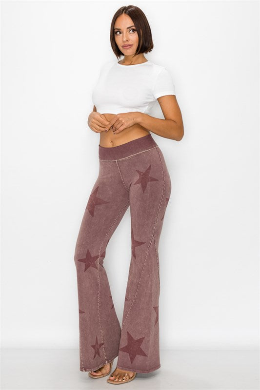 Two-tone printed star mineral washed bell-bottom yoga style pants come in two colors. Choose from a deep mineral washed purple or mineral wash black background. They are super soft and comfy, plus they NEVER bag at the knee. You will be surprised at the amazing comfort of these pants.