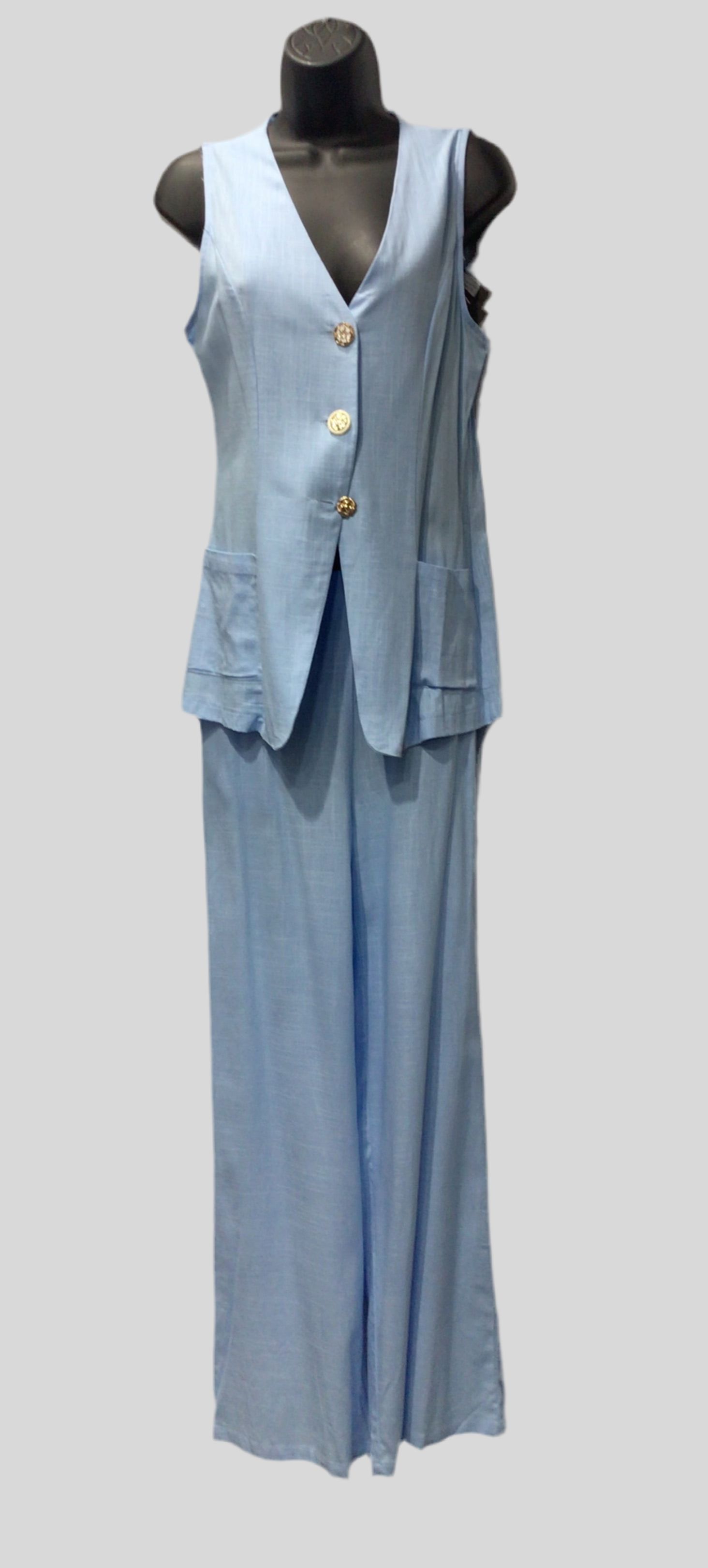 What a great set made with a wrinkle resistant Linen and Viscosa blend fabric. The unique buttons add extra detail to this lovely sky blue pant set. You will love this sleeveless vest-style top with the comfortable matching pants (sold as a set).