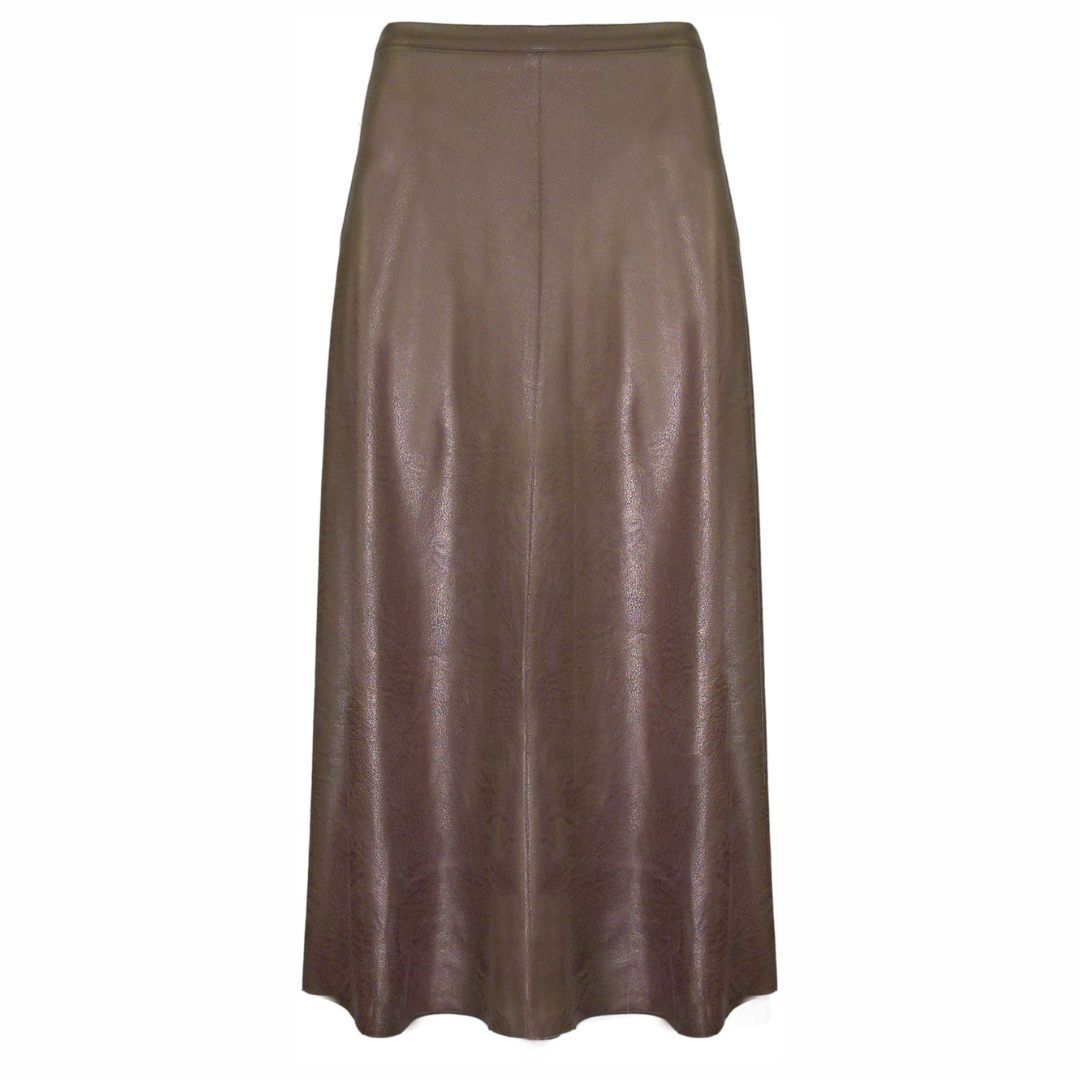 Step into sophisticated style with this A-line midi skirt, crafted from a luxurious faux vegan leather. The fabric is amazingly soft with a lush bronze metallic finish giving it a subtle sheen. This a versatile piece that's easy to dress up or down. A smooth, flowing silhouette ensures a comfortable fit and effortless movement. Pair it with a cozy sweater and boots for a chic daytime look, or dress it up with a silky blouse and heels for an evening out. This skirt is a modern essential that will add a touch of polish to any outfit. Pairs beautifully with our quilted studded jacket style #BCJ101C22.