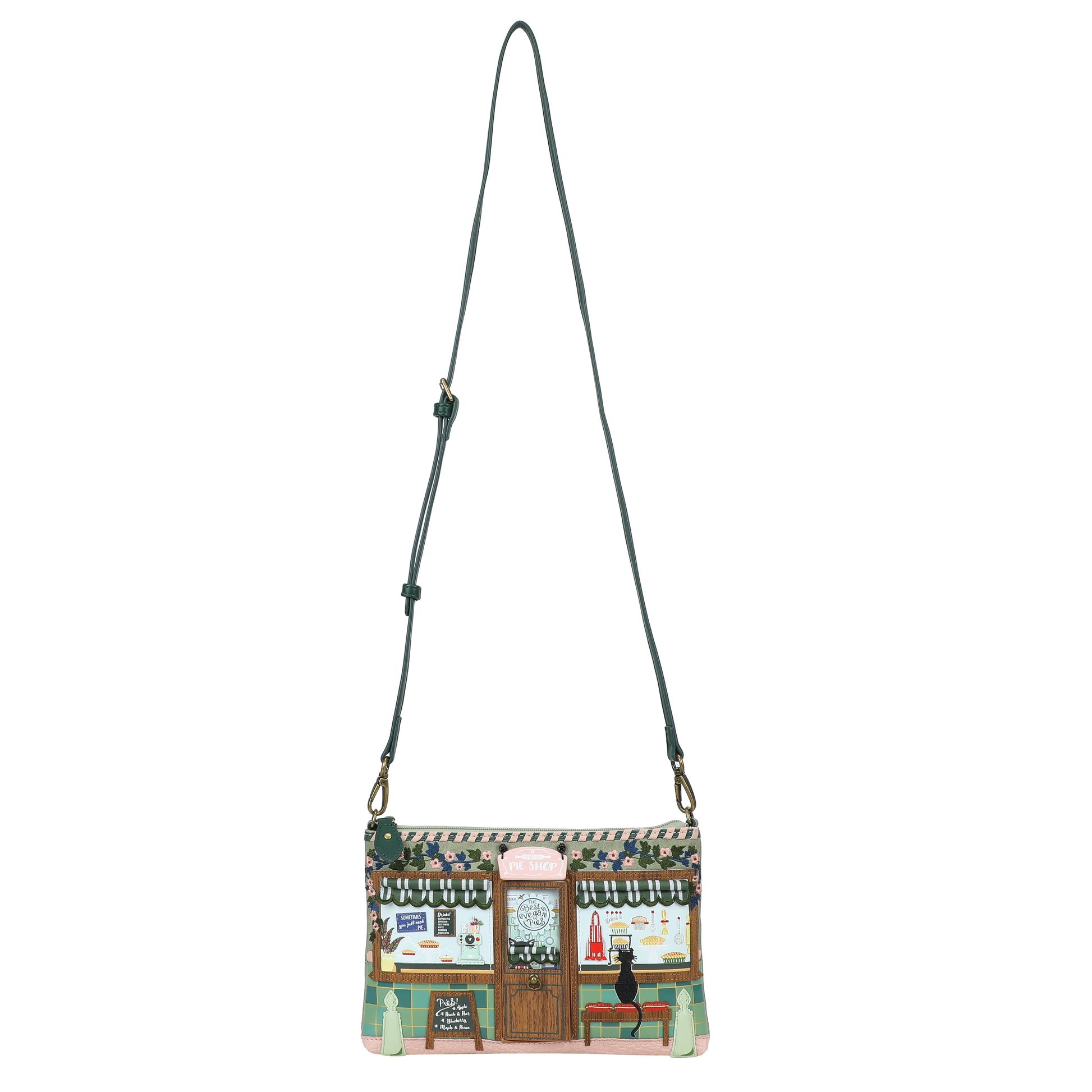 This charming vegan leather bag offers a timeless silhouette with a fresh, modern twist. Its detachable and adjustable strap allows you to switch effortlessly between pouch, shoulder, or crossbody styles. Designed with a spacious main compartment and thoughtful pockets, it keeps your essentials neatly organized wherever you go. The playful storefront artwork, hand-crafted details, and antique gold accents make it a standout accessory for any occasion.